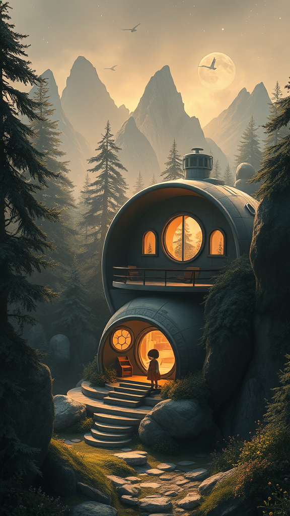 Digital 2D art capturing the essence of Miyazaki's style, showcasing an exquisitely detailed futuristic sci-fi magical landscape. A small, adorable girl resides with her plushified, friendly giant tanuki companion amidst an expansive, enchanted wilderness. The scene features intricately designed, round futuristic architecture with multilayered simplicity—a cozy cabin nestled high in the trees. The atmosphere is illuminated with dramatic, soft lighting, carefully composed with the rule of thirds to create a cinematic feel. Make subtle creative alterations while preserving the main theme.