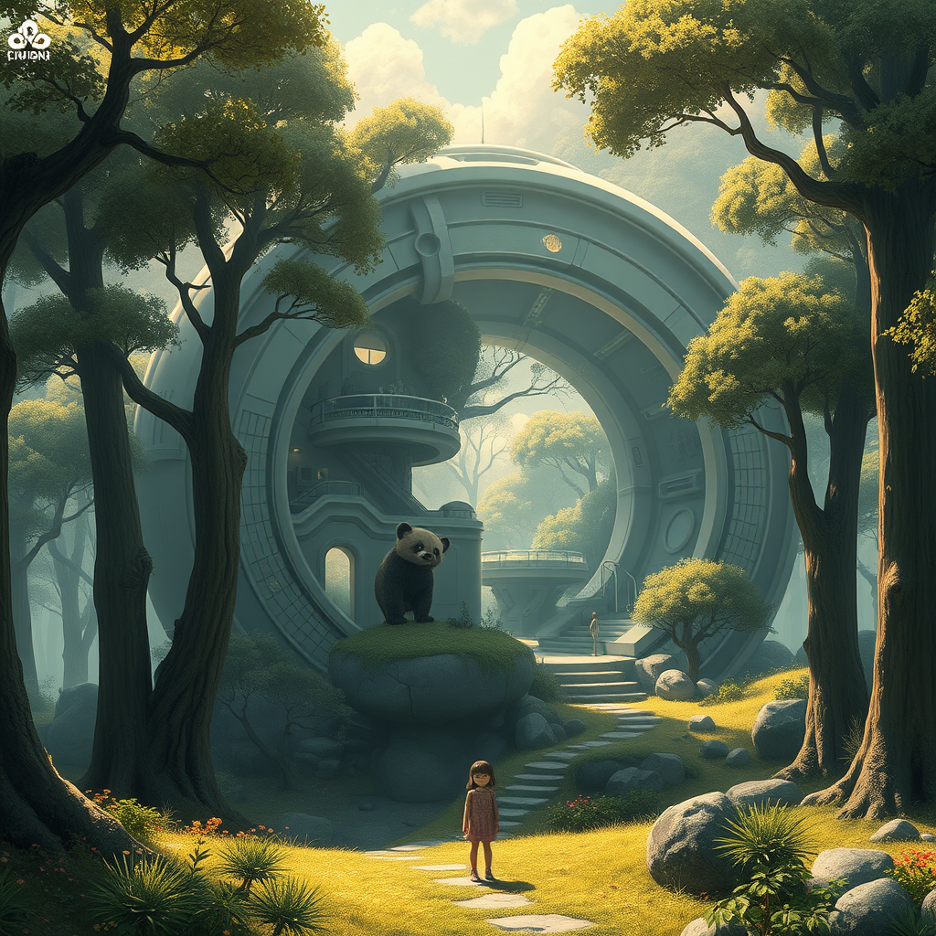 Digital 2D artwork in the style of Miyazaki, featuring an incredibly detailed futuristic, sci-fi, and magical dreamy landscape. A small, cute girl lives alone amidst the grandeur of the wilderness, accompanied by a plushified friendly giant tanuki. The scene showcases an intricate, round futuristic architecture, with simple, multilayered elements nestled among tree habitats. Dramatic yet soft lighting enhances the picturesque setting, following the rule of thirds for a cinematic effect. The composition is further enriched with subtle creative touches, blending the harmony of nature with advanced design elements.