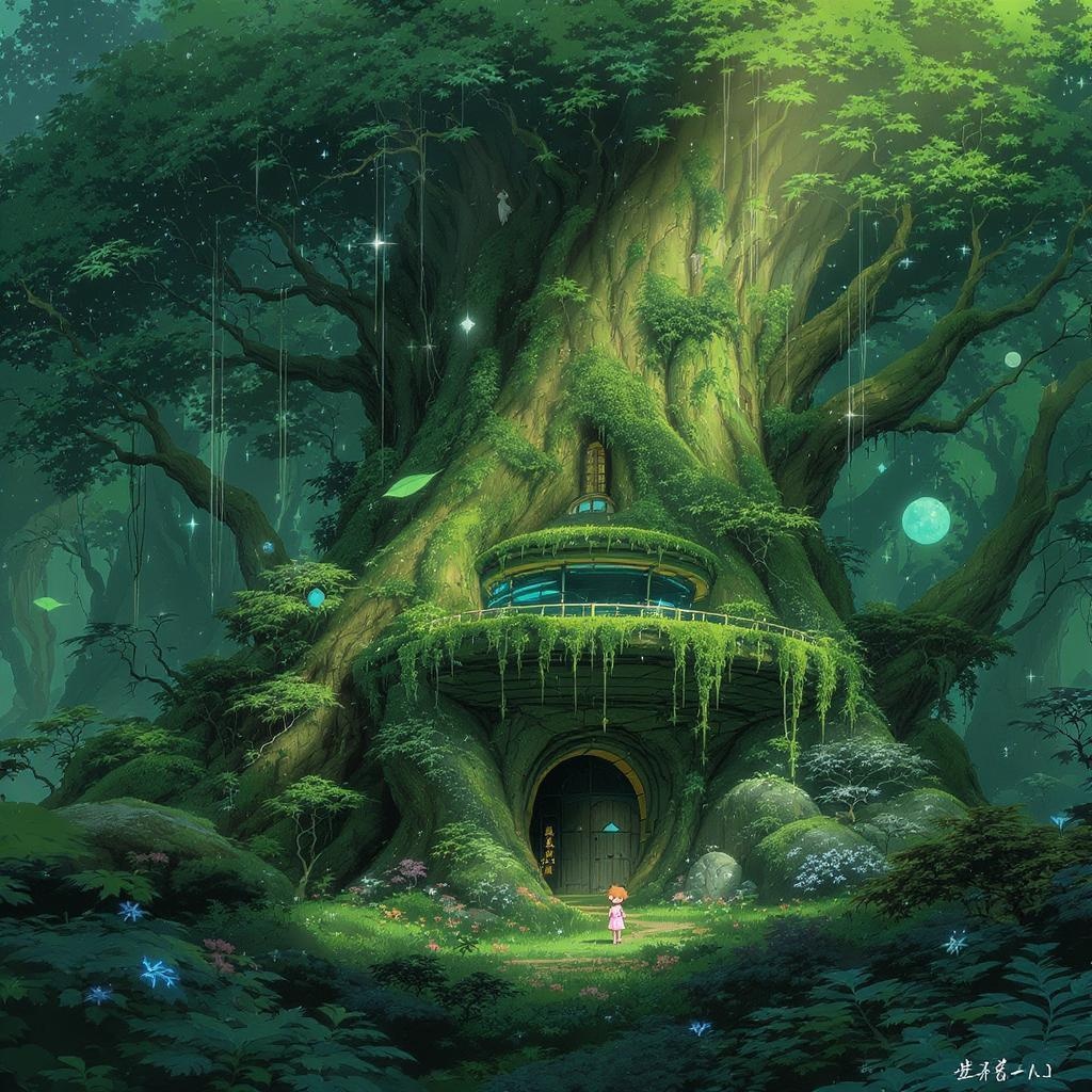 Digital 2D artwork in the style of Miyazaki, featuring an incredibly detailed and intricately designed landscape that seamlessly blends elements of futuristic and sci-fi with a sense of magical dreaminess. A small, adorable girl resides alone amidst the vastness of a lush wilderness, where towering trees form a gigantism setting. Her home is a simplistic yet sophisticated round architecture, featuring multiple layers and nestled gracefully among the tree branches. The scene is bathed in dramatic, gentle lighting that enhances its cinematic quality, adhering to the rule of thirds to create harmonious composition, while minute details invite viewers to explore the enchanting, otherworldly environment.
