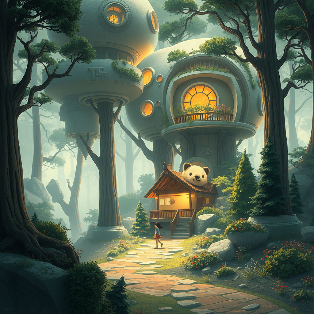 Digital 2D illustration, inspired by Miyazaki's style, featuring an intricately detailed futuristic and magical landscape. A small, endearing girl lives alone with her plushified, friendly, large tanuki companion amidst an expansive, enchanting wilderness. The scene unfolds within a captivating environment of futuristic, spherical, multilayered architecture. Her home, a cozy cabin nestled among the towering trees, exudes warmth and wonder. The setting is bathed in dramatic, soft lighting, emphasizing the ethereal ambiance. The composition follows the rule of thirds, creating a cinematic and dreamlike atmosphere, inviting viewers to explore a world where innocence and fantasy seamlessly coexist.
