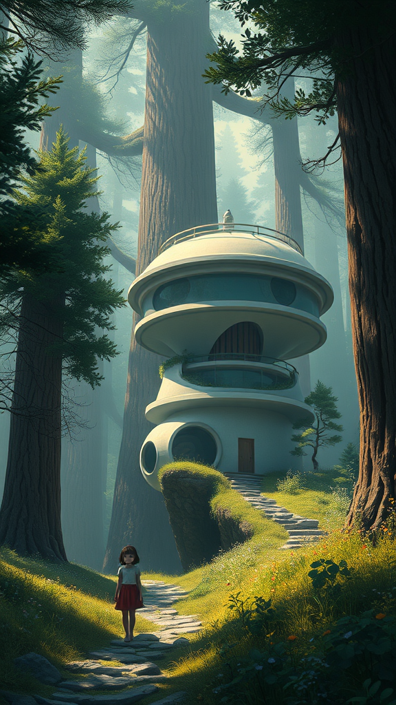 Digital 2D, influenced by Miyazaki's style, showcasing ultimate detail with the tiniest intricate features, a futuristic, sci-fi, and magically dreamy landscape scenery. It features a small, endearing girl navigating her existence amidst the enormity of the wilderness. The setting includes round and futuristic yet simple multilayered architecture, with an elaborate dwelling nestled within the trees. The scene is enveloped in dramatic, gentle lighting, adhering to the rule of thirds, and resonates with a cinematic feel.