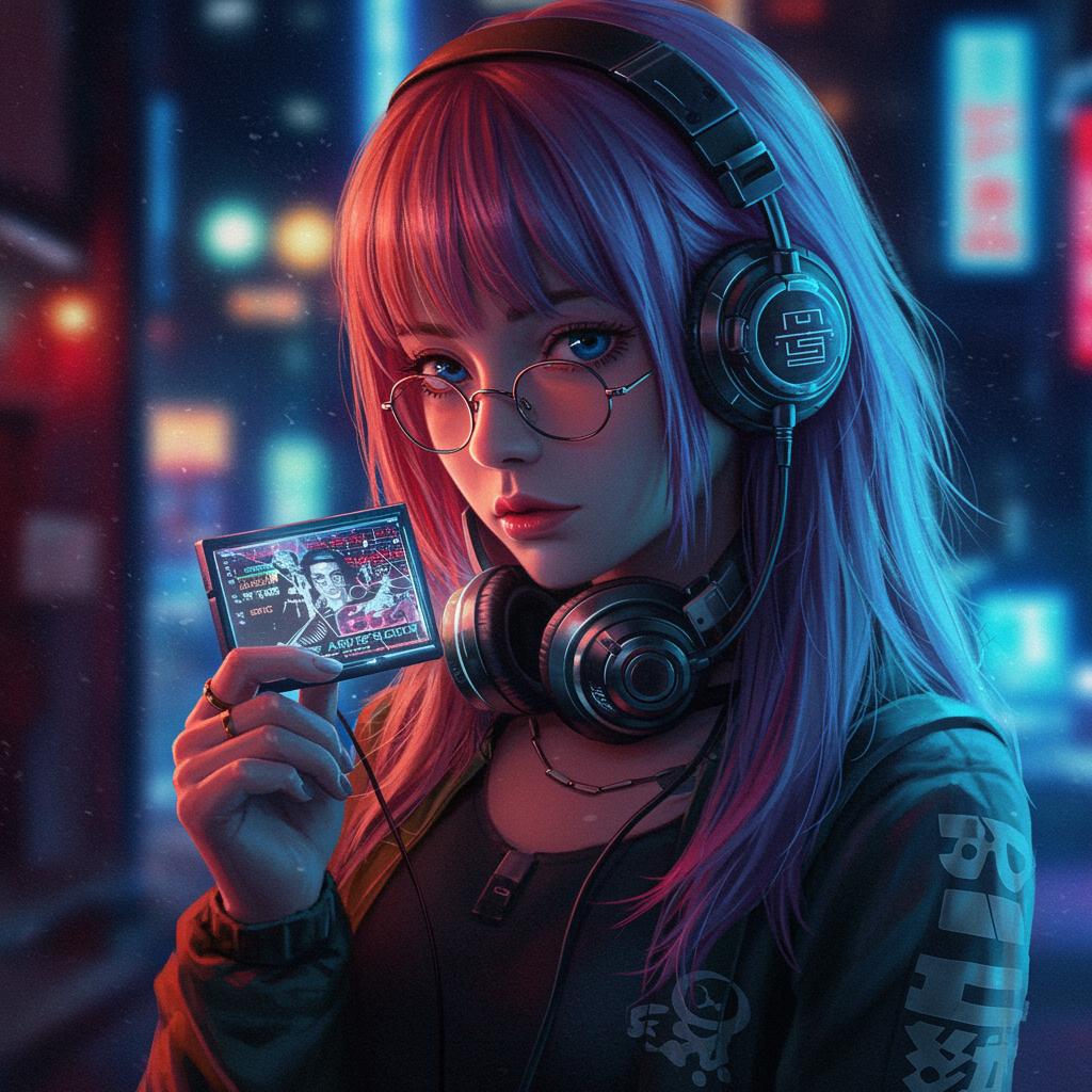 Digital anime girls HD desktop wallpapers in the style of neon realism, postmodern portraiture, intricate street scenes, precisionist art, and gadgetpunk, showcasing eerily realistic fine art realism. Captured with a Fujifilm X-T4 and a Sony FE 85mm f/1.4 GM lens. The composition should reflect a sense of vibrant urban life, with complex layers and a strikingly realistic portrayal that blends the digital and the tangible, capturing the essence of gadget-infused environments with a focus on bold colors and precise detail in a raw aesthetic.