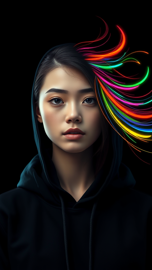 Digital art, close-up portrait of a female figure, digital flat color, frontal view focusing on upper body and face, wearing a dark hoodie, the figure is surrounded by swirling abstract patterns, neon-colored streaks emanate from the head, simplistic design with a plain dark background enhancing the subject's visibility, vibrant colors with contrasting shadows highlight the colorful streaks, minimal facial features focusing on abstract elements, sharp contrast between the subject and background, emphasizing the vivid and dynamic design.