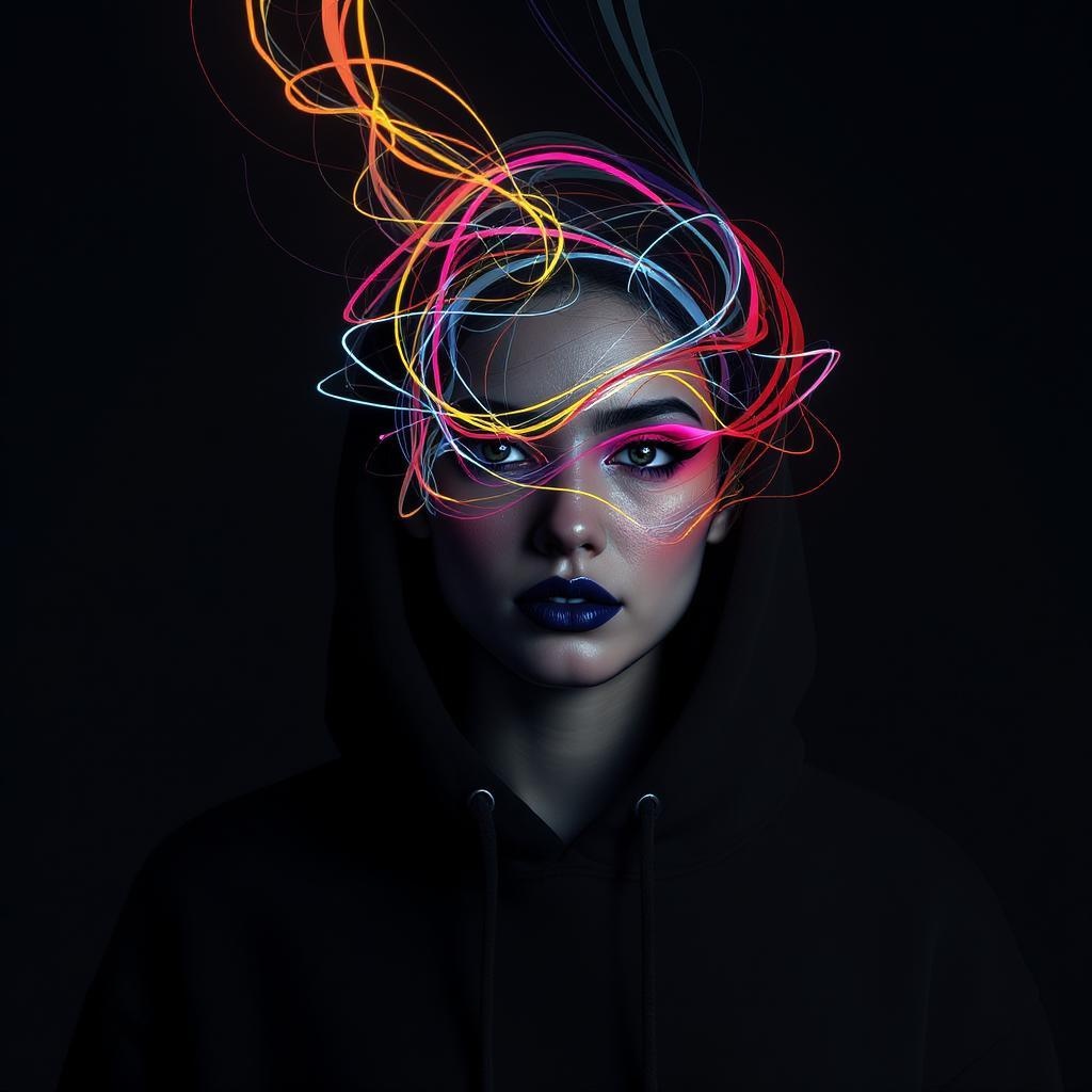 Digital art, close-up portrait of a female figure, digital flat color, straight on view, focus on the upper body and face, dark color hoodie, figure depicted with an abstract swirl, vibrant neon streaks emerging from the head, minimalistic style with a plain, dark backdrop to highlight the subject, vivid colors with contrasting shadows to accentuate the streaks, simplified facial features drawing attention to the abstract elements, stark contrast between the figure and the background, subtle adjustments enhancing the overall abstract theme.