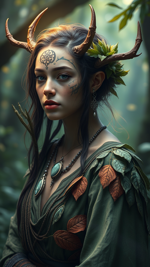 "Digital art, concept art, druid, profile picture, ultra quality, wearing leaf-patterned clothing, with intricate face tattoo marks, set in a fantasy world with cinematic lighting, vibrant and detailed, focused composition, showcasing a harmonious blend with nature. The artwork captures the mystical essence of a druid, emphasizing natural elements and ethereal ambiance, avoiding technical flaws and maintaining all proportions with precision for a visually stunning representation."