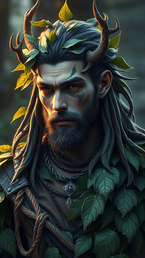 Digital art concept depicting a druid for a profile picture, showcasing ultra-quality features. The druid wears clothing made of leaves and bears face tattoo marks, set in a fantasy world with cinematic lighting. The focus is on avoiding low-resolution issues and ensuring high-quality detail, steering clear of text errors, cropped or off-frame elements, and maintaining natural anatomy. The artwork should steer clear of morbid or disfigured elements and avoid duplicates, mutations, or poorly drawn aspects. It should be free of any distracting artifacts like usernames or watermarks.