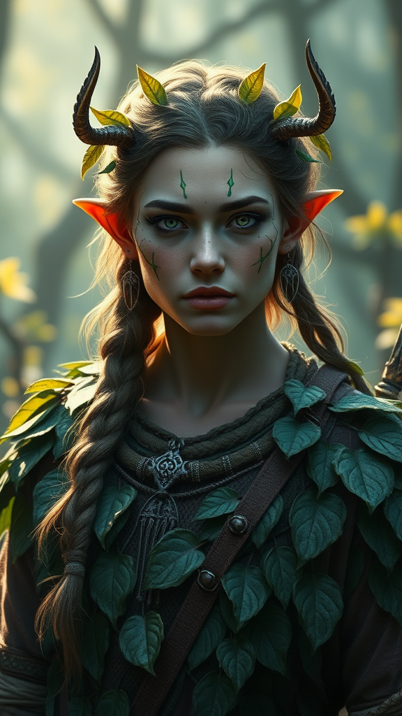 Digital art concept focusing on a druid in a fantasy world, designed as a high-quality profile picture. The druid is adorned with leaf-patterned clothing and subtle face tattoos, set against a backdrop of cinematic lighting. Emphasis on clear, crisp detailing and vibrant colors. Avoid elements such as low resolution, text errors, cropping issues, and poor quality visuals. Ensure the character has proportional anatomy and features, set within a harmonious composition. Refrain from including disfigurements, unnatural mutations, or irrelevant elements like usernames and watermarks.