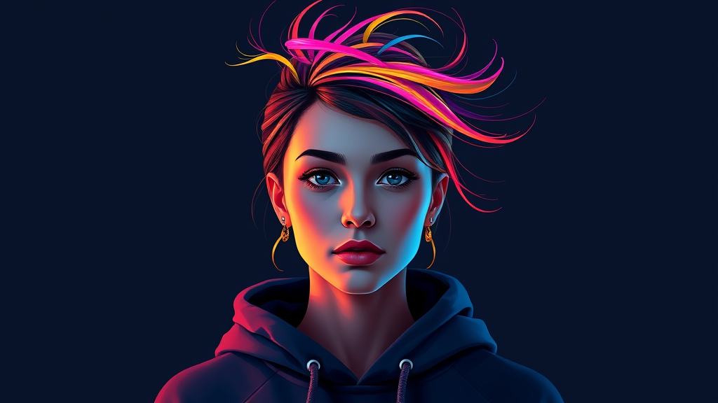 Digital art depicting a close-up portrait of a female figure in a digital flat color style, straight on view focusing on the upper body and face. She wears a dark color hoodie, while neon colored streaks flow in an abstract whirl from her head. The design is simplistic with minimal facial features, set against a plain, dark background to enhance visibility. The composition is brightly colored with contrasting shadows to emphasize the colorful streaks, creating a sharp contrast between the subject and the background, while incorporating a subtle interplay of light reflections to add depth and intrigue.