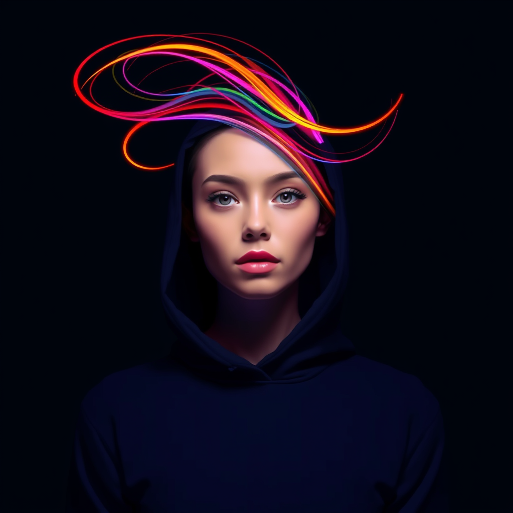 Digital art depicting a close-up portrait of a female figure in vibrant, flat colors. The view is straight on, highlighting the upper body and face. The figure is wearing a dark-colored hoodie and is surrounded by abstract, swirling neon streaks that flow dynamically from her head. The background is plain and dark, providing high contrast that accentuates the brightness of the colorful streaks. The composition focuses on minimal facial features, allowing the abstract elements to take center stage. The image plays with sharp contrasts between the subject and the background, using simplified, yet expressive design elements to create a striking visual. The scene is further enhanced by bold color choices and the dramatic interplay of light and shadow.