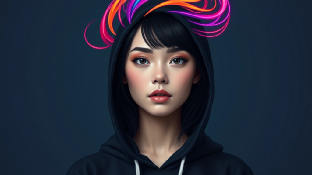 Digital art, headshot portrait of a female figure, digital flat color style, frontal view focusing on upper bust and face, dark hoodie attire, figure adorned with an abstract swirl, vibrant neon streaks cascading from the crown, minimalist with a plain deep-toned background for subject prominence, vivid colors with contrasting shadows to highlight the neon strands, subtle facial features with focus on the abstract elements, stark contrast between figure and background.