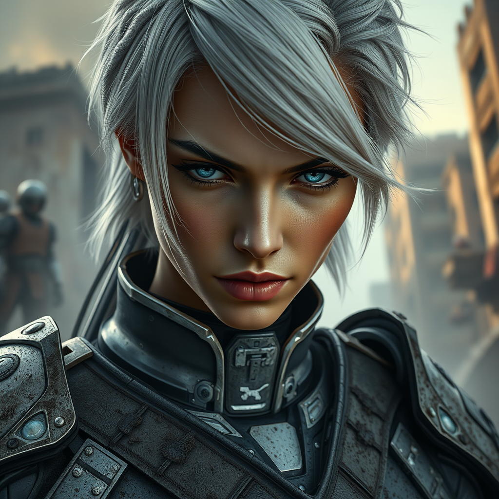 Digital art, high quality, hyper-realistic, ultra-detailed, low camera angle, half-body portrait of a strikingly fierce female warrior, adorned in a complex minimalist ceramic exo-suit, gazing intensely downwards with asymmetric platinum hair and crystalline piercing eyes. Her stunningly kind face contrasts with battle dirt, shrouded in mist, showcasing perfect feminine contours and unblemished beauty. The natural texture of her skin is evident as she stands against a backdrop of a dilapidated, futuristic city, enveloped in dramatic volumetric lighting.