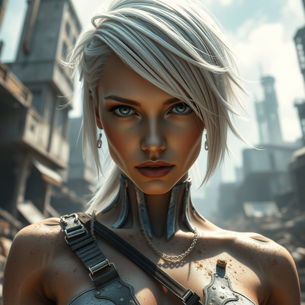 Digital art, high quality, ultra realistic, intricate details, low camera angle, half-body portrait: stunning, fierce female warrior in a minimalistic porcelain-like exo-skeleton, gazing down with striking asymmetric platinum hair and intense, clear eyes; a beautiful and kind visage, accented by dirt and fog, athletic physique, natural beauty with lifelike skin texture; set against a backdrop of a ruined, futuristic city, with dramatic volumetric lighting casting dynamic shadows.