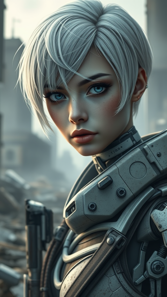 Digital art masterpiece depicting an ultra-realistic half-body portrait of a stunning and fierce female soldier. She dons a sophisticated and minimalistic porcelain exo-skeleton that accentuates her dynamic presence as she gazes downward at the viewer. Her asymmetric white hair frames her strikingly clear and intense eyes, complementing her beautiful and compassionate face. Despite the grime and fog surrounding her, her flawless natural beauty and skin texture are evident. She stands amidst the ruins of a futuristic city, with dramatic volumetric lighting highlighting her perfect form and adding depth to the scene.