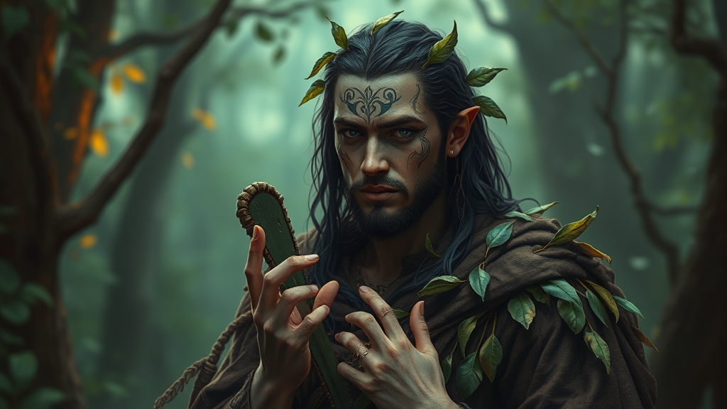Digital art of a druid in a fantasy world, designed as a profile picture. The piece features ultra-quality depiction with the druid adorned in cloths made of leaves and sporting distinct face tattoos. The scene is illuminated with cinematic lighting to enhance the mystical ambiance. The artwork avoids any elements of low resolution, text, cropping, or poor image quality, ensuring the absence of jpeg artifacts, duplicates, or any disfigured or mutated features. The anatomy is accurate with well-drawn hands and face, maintaining balanced proportions and avoiding any deformities or extra limbs. The composition refrains from including details like long necks, extra fingers, or any form of digital anomalies such as watermarks, usernames, or signatures.