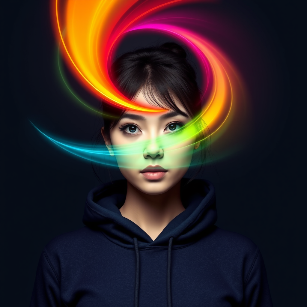 digital art portrait of a female figure, digital flat color, front view, focus on upper body and face, wearing a dark hoodie, abstract whirl design with neon colored streaks radiating from the head, simple with a plain dark background enhancing subject visibility, vivid colors and contrasting shadows highlighting the colorful streaks, minimal facial features emphasizing the abstract design, strong contrast between subject and background