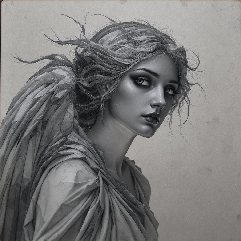 A surreal digital artwork depicting the head of an angel, whose features are intricately detailed and expressive. The angel's wings are crafted from a paper collage, using a rich palette of varying grey tones to create a monochrome masterpiece. The background presents a textured surface that enhances the overall depth and composition of the piece. Soft edges and delicate lighting effects interplay to add dimension and subtlety, with elements of abstraction woven throughout to elevate the ethereal quality of the illustration.