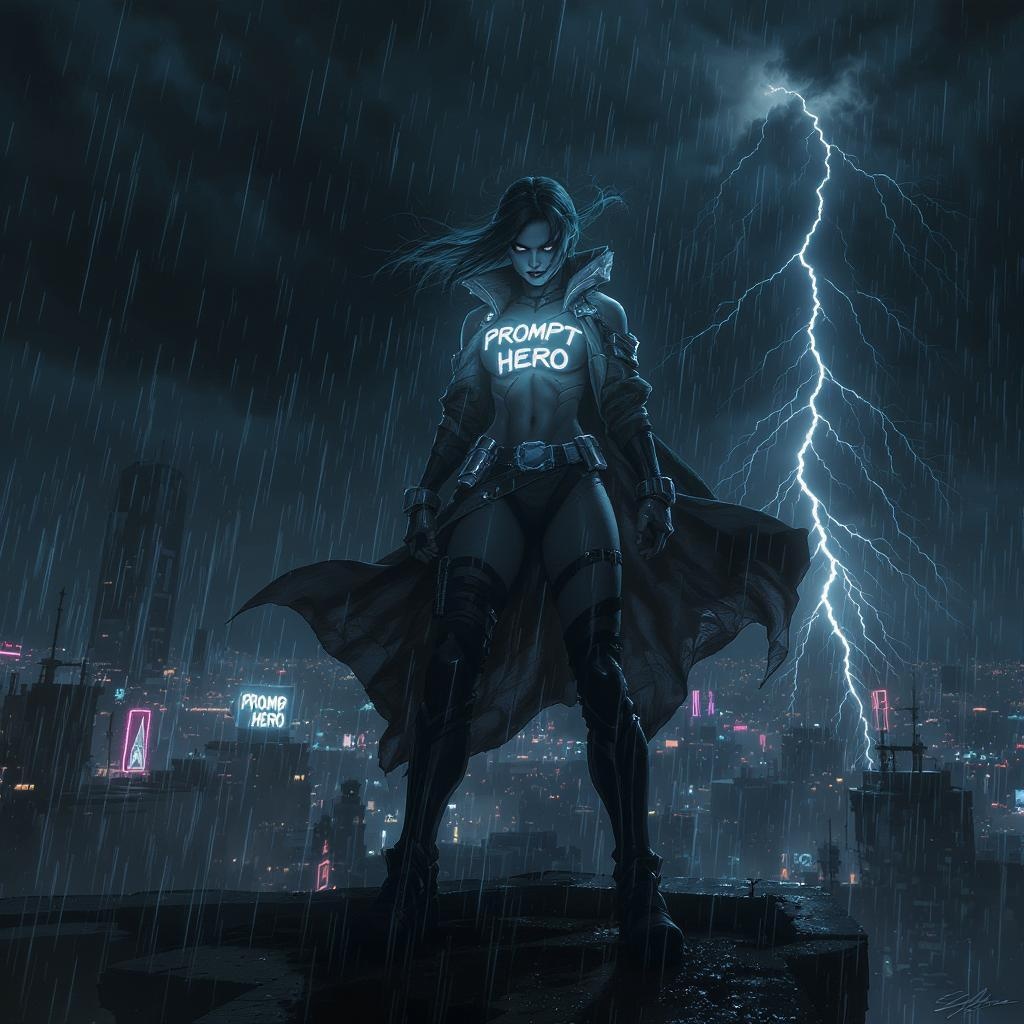 Digital artwork concept art cyberpunk girl branded with Prompt Hero text on chest standing atop a rooftop overlooking a sprawling dark dystopian city dynamic pose fierce demeanor comic book style hyper intricate hyper detailed atmospheric ominous lighting dramatic contrasts amid dark stormy night captured with Hasselblad camera effect of long exposure her hair and clothing caught in the wind radiating intensity neon lights flicker in the background casting reflections off wet surfaces as lightning crackles in the distance enhancing the foreboding ambiance and futuristic setting.