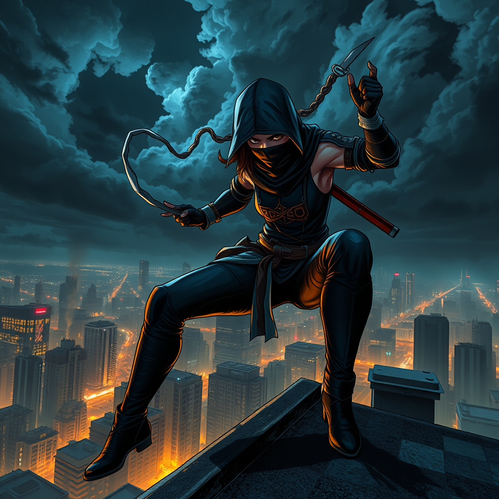 Digital artwork concept art featuring a fierce female ninja adorned with the Prompt Hero emblem on her chest, poised dynamically on a rooftop overlooking a dark dystopian cityscape. The scene unfolds in a comics style with intricate and detailed artistry. Ominous and dramatic lighting casts shadows across the dark stormy night, enhancing the tension of the moment. Captured with the precision of a Hasselblad camera using a long exposure, the image showcases swirling storm clouds and a vibrant, electrifying atmosphere, as the city lights shimmer below the agile figure.
