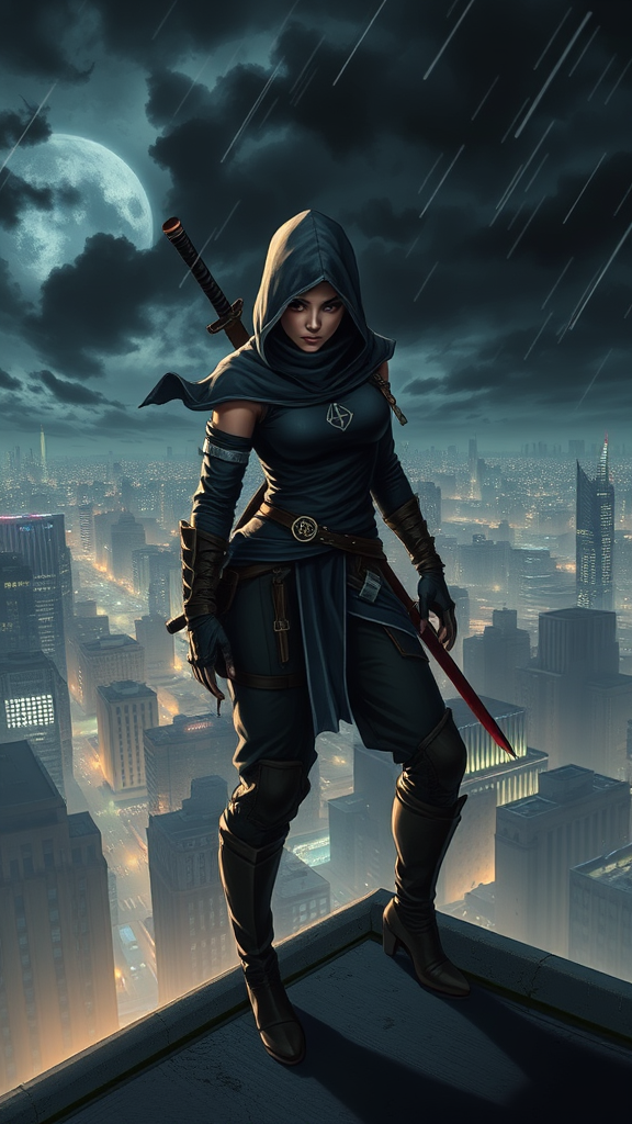 Digital artwork concept art featuring a fierce female ninja adorned with a subtle Prompt Hero insignia on her chest, poised on a rooftop overlooking a dystopian city shrouded in darkness. Her dynamic stance exudes intensity, embodying the essence of a fierce warrior. The scene is depicted in a comic book style with intricate, meticulous detail. Ominous lighting casts dramatic shadows across the sprawling urban landscape, under a stormy night sky. The image captures a sense of urgency and tension, reminiscent of a long exposure shot with a Hasselblad camera, enhancing the dramatic atmosphere.
