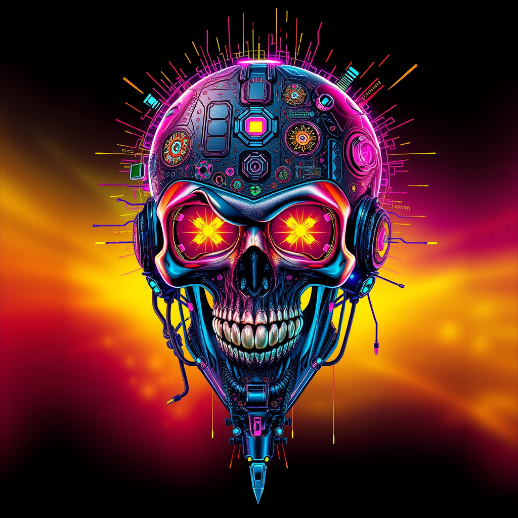 Digital artwork of a cyberpunk skull encased in futuristic armor, featuring intricate, maximalist details. The design is colorful and vibrant, with neon accents and intricate circuitry patterns intertwining with biomechanical elements. The skull has luminous eyes and is surrounded by a halo of digital glitches, reflecting a chaotic energy. The elongated composition highlights the sleek, edgy aesthetics, blending metallic textures with vivid, dynamic color schemes.