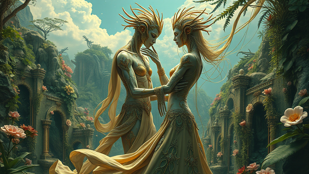 Digital hyper-realistic dreamscapes of statuesque, gold and cyan adorned, androgynous androids amidst lush, organic landscapes, frozen in intimate, swaying dance, inspired by mystical romance and cosmic wonder, with intricate, bio-mechanical details, evoking an otherworldly sense of timelessness and enchantment, reminiscent of Starowieyski's eclectic, romantic illustrations, infused with a futuristic, sci-fi essence.