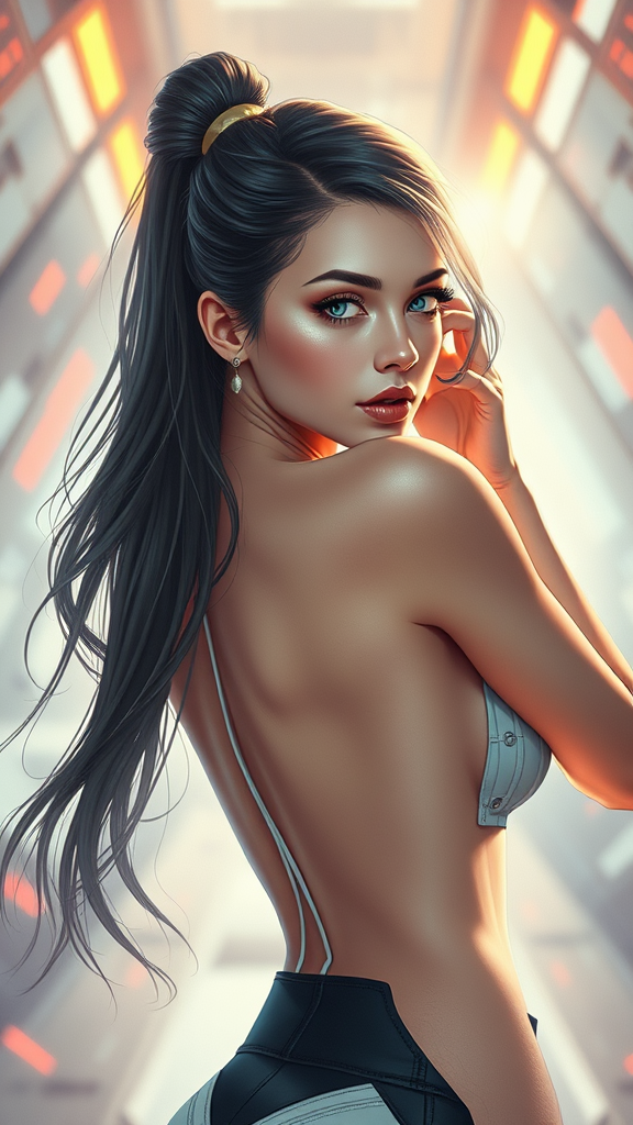 Digital illustration featuring a stunning neofuturistic woman in a half-body shot with an exposed back, showcasing heterochromia with two different colored eyes. The style is inspired by the works of Julia Razumova and Ilya Kuvshinov, highlighting a dynamic pose in an action shot. The color palette consists of soft pastels, creating an intriguing composition with subtle light flares. The background boasts a futuristic setting, rendered in ultra-realistic detail, 8k resolution, capturing a super detailed masterpiece with creative enhancements.