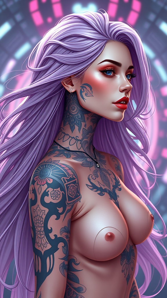 Digital illustration of a stunning neofuturistic woman with long, flowing hair, adorned with intricate face and neck tattoos. Captured in a dynamic and expressive full-body pose by artists like Julia Razumova and Ilya Kuvshinov, this piece showcases pastel coloring and features an interesting composition with light flares illuminating a futuristic setting. The artwork, rendered in 8k, emphasizes realism, showcasing super detailed and masterpiece-level quality. The woman's body is fully visible, ensuring a balanced and harmonious portrayal. Exclude any visual impairments such as disfigurement, mutations, or deformations, and avoid unnecessary elements like blurred sections, artifacts, or text to maintain a crisp, clear aesthetic.