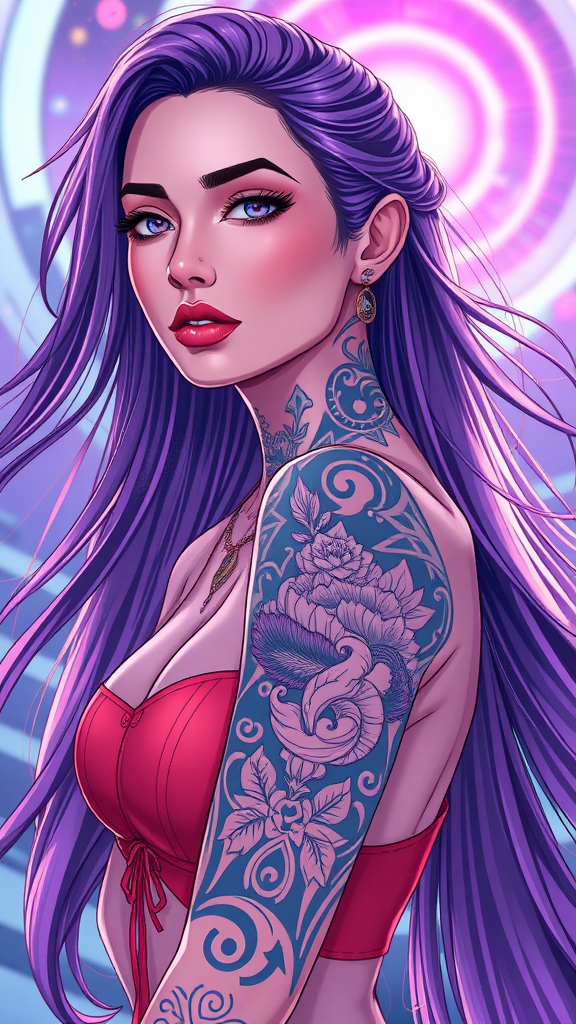 Digital illustration of a stunning neofuturistic woman with long flowing hair, adorned with intricate face and neck tattoos, depicted in a full-body view. The wide-angle composition showcases a dynamic pose capturing her expressive look. Inspired by the styles of Julia Razumova and Ilya Kuvshinov, the artwork features pastel coloring and a unique composition. Light flares enhance the futuristic scenery, combining realism with meticulous detail in a masterpiece 8k resolution. Her pose is powerful and expressive, set against a backdrop that suggests a vibrant future world. The illustration avoids any duplicate or disfigured features, emphasizing natural proportions and beauty, ensuring the image is clear, free from blur, and entirely in focus. The scene is devoid of any text, logos, or artifacts, maintaining the integrity of a high-quality, immersive artwork.