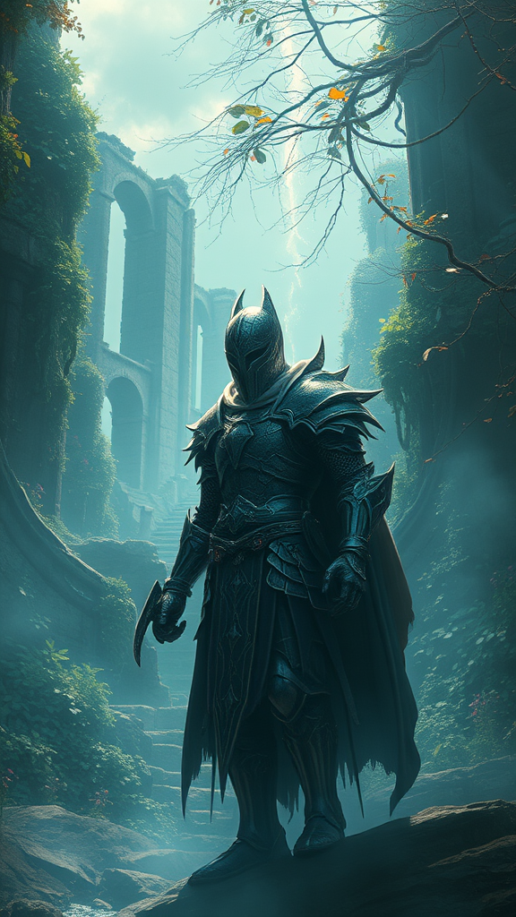 Digital masterpiece of a spectral knight, inspired by greg rutkowski, cgsociety, ferdinand knab, rossdraws, tom bagshaw, featuring ethereal glow, mystic atmosphere, detailed and vibrant landscape, global illumination, dynamic shadows, intricate armor design, shrouded in misty aura, evocative mood, ancient ruins in background, lush foliage intertwined with supernatural elements.