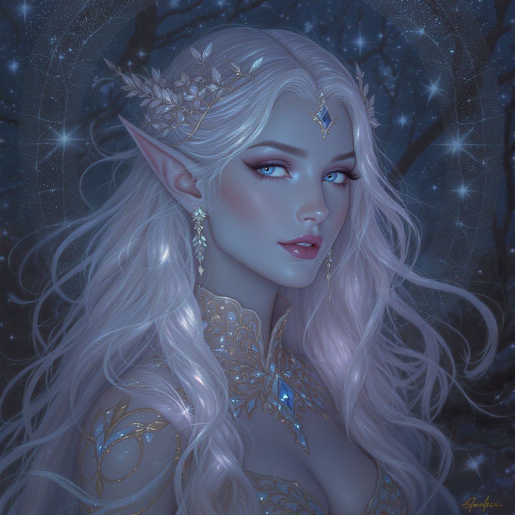 View this AI-generated image featuring a captivating digital painting of a female elf embodying elegance and intricacy with highly detailed features and a graceful aura her expression is serene and wise framed by flowing luminescent hair adorned with delicate silver leaves her attire is a blend of i