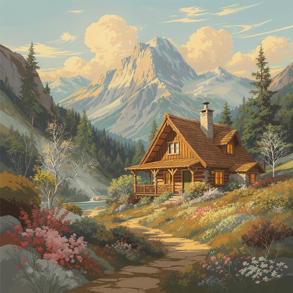 Digital painting of a charming cabin nestled on a mountainside, rendered in vector art style inspired by American scene painting, 1950s illustration aesthetics. The wide shot captures the intricate details of the landscape, creating a cozy and inviting atmosphere. The scene is enhanced by lush greenery and a serene sky, evoking warmth and nostalgia through its richly detailed 3D illustration nuances.
