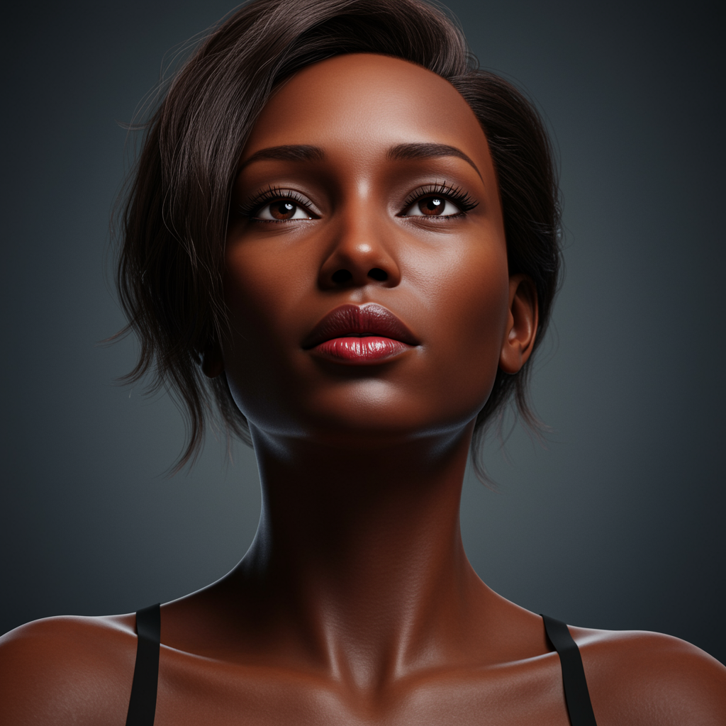 Digital painting of model Jasmine Tookes as an anime character, high resolution HDR unreal engine hyperdetailed sharp focus, trending on ArtStation and DeviantArt. Inspired by Yasutomo Oka, Jovana Rikalo, Audrey Kawasaki, Josephine Wall, Thomas Kinkaid. Masterpiece, best quality, official art, extremely detailed CG unity 8k wallpaper. A woman with highly detailed, perfect eyes, smooth perfect face, perfect lips. Feminine, proportioned body, relaxed posture, with a subtle smirk. Iridescent real hair movement, realistic light and shadow. Ultra quality, insanely detailed, octane render, beautiful composition with intricate and award-winning photograph qualities. Anime character with mature features, 50 years old, deep red lips, enhanced nasolabial folds. Hair styled up, exuding a cyberpunk 2077, blade runner, fifth element vibe. A sexy, mature aesthetic looking upwards, capturing a high detailed face with soulful expression.
