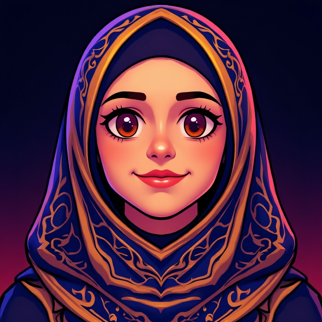A vibrant digital portrait of a woman with expressive eyes and a head scarf, blending influences from RossDraws and Artgerm, capturing a mix of realism and stylized charm. The color palette is rich and dynamic, with bold contrasts and luminous highlights. The composition integrates the soft, ethereal quality of Atey Ghailan's work, while maintaining the distinct cartoon vibrance associated with RossDraws. The woman's serene expression is framed by the fluidity of Lois van Baarle's line work, emphasizing gentle curves and delicate features. The scarf features intricate patterns, adding an extra layer of detail and cultural depth to the portrait, evoking a sense of mystery and elegance.