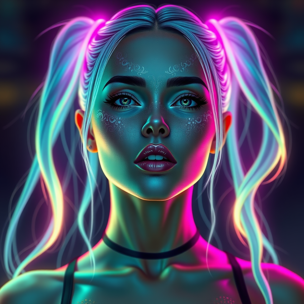 digital portrait of a woman with long, luminescent pigtails glowing in vibrant neon hues, inspired by video game avatars, enhanced with intricate detailing and ethereal lighting effects reminiscent of a futuristic VR world, her expression a blend of mystery and power