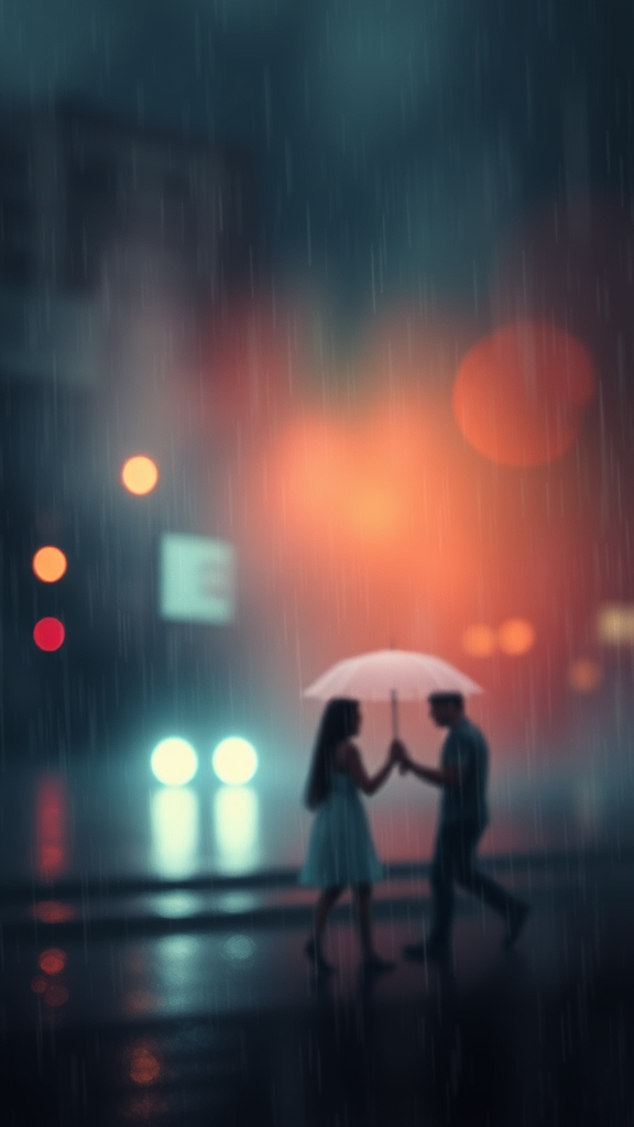 Digital wallpaper, a memory of love, soft colors, dramatic scene, nostalgic, digital artwork, rainy ambiance, deeply emotional, hauntingly memorable, intricate detail, inspired by Milo Manara and Russ Mills, blurred quality, abstract textures, atmospheric imperfections, surreal elements, distorted reality, evocative composition, emotionally charged, impressionistic, imperfect form, ethereal presence, timeless echoes.