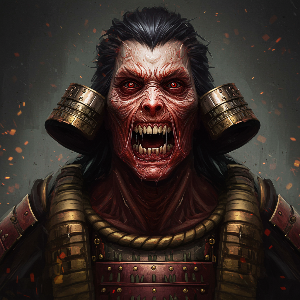 Digital wallpaper portrait of a brutal cyberpunk samurai in an anime style, influenced by Marvel Comics, featuring dark and muted colors. The composition is epic and dramatic, depicted in a very intricate digital painting. The character is portrayed with poor-quality traits, including visible jpeg artifacts and elements that are duplicated, ugly, morbid, and mutilated. The figure shows poorly drawn hands and face, with mutations and deformities, such as deformed and dehydrated features, bad anatomy, and wrong proportions. Additional errors include extra limbs, cloned and disfigured faces, gross proportions, and malformed limbs. There are missing and extra arms and legs, an elongated neck, and elements like camera signatures, watermarks, logos, and other obscure markings that seem cut off or censored. The anatomy, body, face, and teeth all display notable imperfections and deformities.