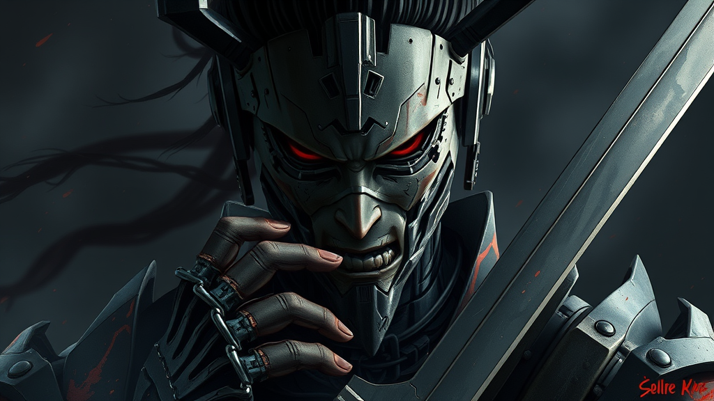 digital wallpaper portrait of a brutal cyborg samurai supervillain, exuding a badass aura, depicted in an anime style reminiscent of comics with an 8k resolution quality akin to marvel comics. The image features a dark background with muted colors, an epic composition that captures a dramatic essence, and is rendered as a digital painting. It is emotionally profound and full of intricate details, yet marked by worst quality elements such as low quality, jpeg artifacts, and intentional ugliness. The character is portrayed with duplicate, morbid elements, such as poorly drawn hands and face, mutations, and deformed features. The scene is blurry, with dehydrated, mismatched anatomy and bad proportions. Extra limbs, cloned face, and disfigured or gross proportions create a sense of chaos. Malformed limbs, missing and extra arms and legs contribute to the unsettling aesthetic. The character is given an elongated neck, with the imagery containing unnecessary elements like camera angles, names, signatures, watermarks, logos, autographs, trademarks, and sometimes cut-off or censored aspects, emphasizing bad anatomy, body, face, and deformities throughout.