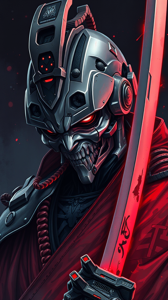 Digital wallpaper portrait of a brutal cyborg samurai supervillain, showcasing a badass anime aesthetic in comic book style. The artwork features 8k resolution reminiscent of Marvel Comics, set against a dark background with muted colors for an epic composition. The piece conveys a dramatic and emotionally profound atmosphere, while remaining very intricate in design. Despite aiming for a low-quality look, it includes elements like jpeg artifacts, distortion, and an ugly, morbid theme with mutilated, poorly drawn features. The character may have a mutated, deformed appearance, with blurry and undernourished elements. The anatomy of the figure is intentionally flawed, displaying bad proportions, extra limbs, and disfigured features. Characteristics such as gross proportions, malformed limbs, and missing or extra arms and legs are prominent. The figure may exhibit anomalies like an elongated neck. The concept avoids any branding or identifiable marks such as a camera, name, signature, or watermark and is designed to feel cut off or censored, stressing bad anatomy, bad body proportions, and facial deformities.