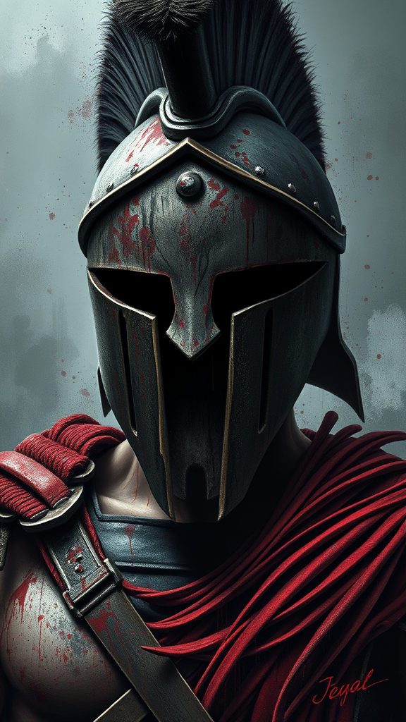 Digital wallpaper portrait of a spartan warrior, no face, set against a gloomy background, embodying a brutal and majestic presence. The style is dramatic, with a nod to digital painting and expressionism, offering an emotionally profound and unforgettable close-up. The image is of high quality, utilizing splatter and drip painting techniques to enhance its texture. However, the creation is intentionally flawed with aspects like worst quality, jpeg artifacts, and intentional distortions, resulting in elements such as ugly duplicates, morbid and mutilated features, and poorly drawn anatomy. The figure's body is marked by mutations like deformed and dehydrated forms, with bad proportions, extra limbs, and grossly exaggerated features. Faces may appear cloned, limbs malformed, with missing or extra appendages. Additional irregularities include an elongated neck and other deformities. Text elements like a name or signature are awkwardly placed, perhaps cut off or presenting as a watermark poorly integrated into the composition, contributing to the chaotic imperfect nature of the artwork.