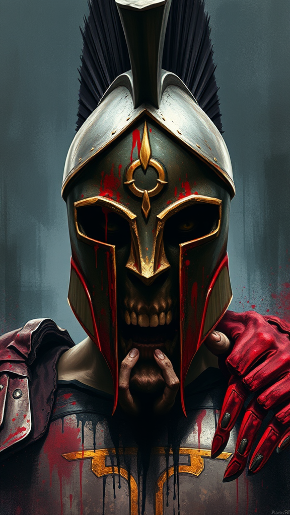 Digital wallpaper portrait of a Spartan warrior, no face, ominous background, powerful, majestic, dramatic, digital painting, expressionism, emotionally impactful, close up, unforgettable, high-quality, splatter and drip painting style, text elements, low resolution, jpeg artifacts, unattractive, duplication, grim, disfigured, roughly drawn hands, roughly drawn face, mutated, deformed, emaciated, flawed anatomy, distorted proportions, surplus limbs, mirrored face, excessive proportions, malformed limbs, absent arms, absent legs, additional arms, additional legs, elongated neck, title, artist mark, logo, signature, trademark, partially visible, obscured, flawed body, flawed face, flawed teeth, irregularities.