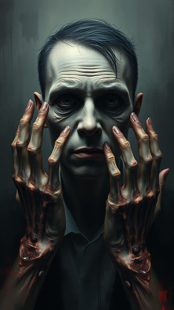 Digital wallpaper portrait of an anonymous figure against a gloomy backdrop, exuding horror and brutality with a cinematic and dramatic flair. This digital painting embodies expressionism and profound emotion, focusing on an unforgettable close-up. Despite being of high quality, the image contains deliberate imperfections such as jpeg artifacts and unattractive elements that add to its eerie charm. The portrayal includes distorted hands and faces with noticeable mutations and deformities, producing a blurred, dehydrated appearance. The anatomy is intentionally flawed with odd proportions, featuring extra or missing limbs, disfigured forms, and grossly exaggerated features like a long neck. Accompanying the surreal imagery are misplaced details such as stray signatures, watermarks, or logos, creating a sense of chaotic artistry.