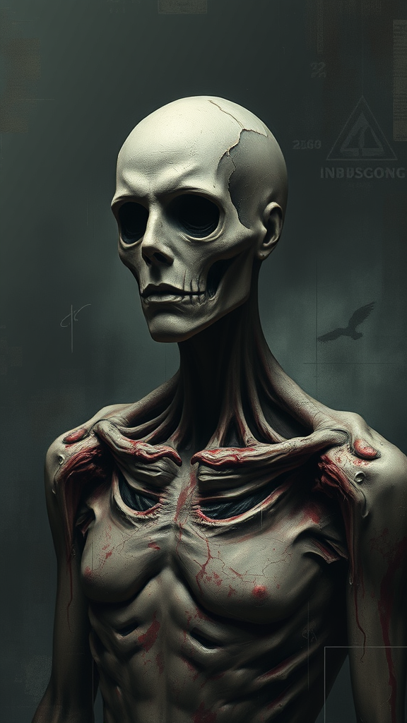digital wallpaper portrait of an anonymous figure with no face, set against a gloomy, cinematic background blending horror and brutal majesty. Featuring a dramatic, expressionist touch that conveys profound emotion, this high-quality digital painting captures an unforgettable essence. The artwork's details are distorted and surreal, with elements like jpeg artifacts, duplication, and missing parts creating a morbid, deformed appearance. The anatomy is flawed with extra limbs and disfigured proportions, conveying a sense of mutation. Oversized features like a long neck contribute to the unsettling aesthetic. The composition is further altered with a mix of signatures, logos, and watermarks partially obscuring the figure, adding layers of mystery to the portrait's haunting allure.