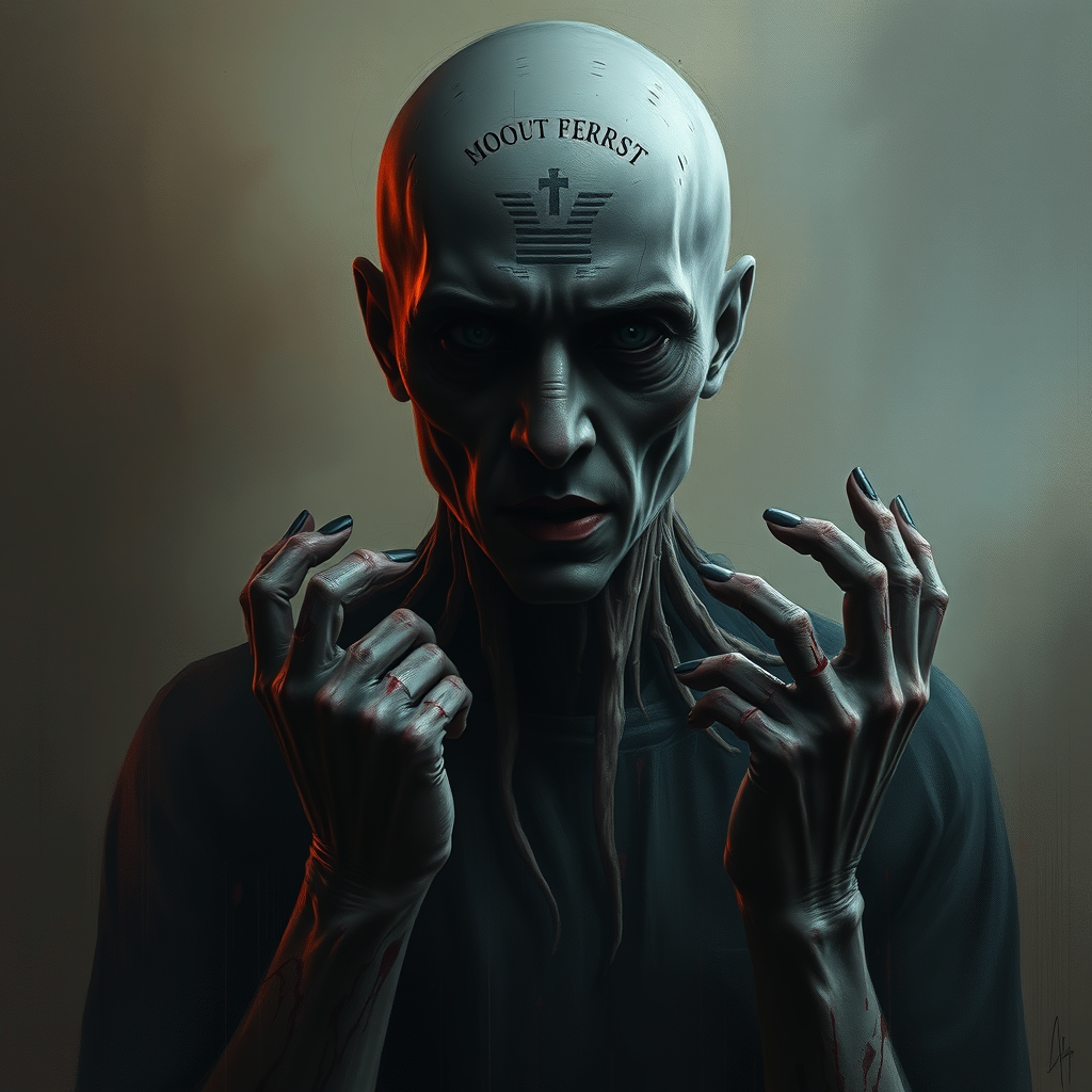 Digital wallpaper portrait of an enigmatic figure with an obscured face, set against a somber, atmospheric backdrop. The scene exudes elements of horror and brutality, yet retains a sense of majesty and cinematic drama. The digital painting style draws on expressionism to convey a deep emotional impact. The close-up view captures an unforgettable, high-quality image, but intentionally incorporates aspects of low-resolution artifacts like jpeg distortions. The artwork plays with themes of the grotesque, featuring distorted features and malformed anatomy, such as extra or missing limbs, elongated neck, and exaggerated proportions. Elements like a duplicated face and disfigured limbs add to the unsettling, morbid quality. Various visual discrepancies appear, including poorly rendered hands and facial features, as well as signs of dehydration and mutation. The composition includes hints of unauthorized elements like signatures and logos, with portions cut off or censored, enhancing its eerie, chaotic nature.