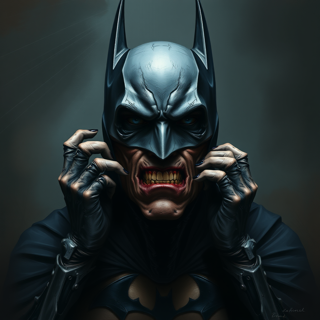 digital wallpaper portrait of batman, dark knight, in the style of comics, 8k, rough, inspired by dark comics, desperate, shadowy background, subdued colors, grand composition, theatrical, digital painting, deeply emotional, highly detailed, text, worst quality, low quality, jpeg artifacts, unattractive, duplicate, morbid, mutated, poorly illustrated hands, poorly depicted face, distorted, blurred, emaciated, flawed anatomy, bad proportions, extra limbs, mirrored face, disfigured, bizarre proportions, misshapen limbs, missing arms, missing legs, additional arms, additional legs, elongated neck, camera, title, watermark, insignia, signature, trademark, cropped, obscured, flawed anatomy, flawed body, flawed face, flawed teeth, abnormalities.