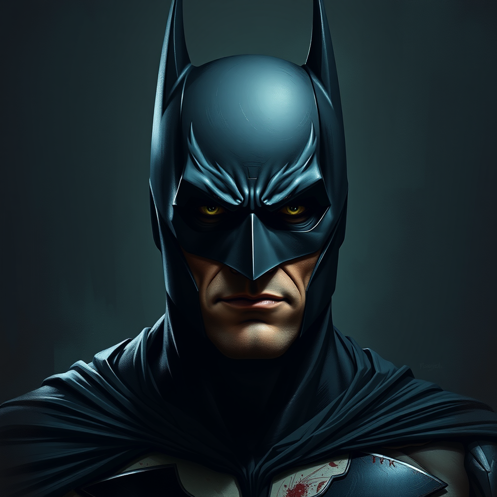 digital wallpaper portrait of batman, dark knight, in the style of comics, 8k, gritty, inspired by marvel comics, somber, dark background, subdued colors, grand composition, dramatic, digital painting, deeply emotional, very detailed, text, low quality, jpeg artifacts, unattractive, duplicate, unsettling, distorted, poorly drawn features, mutated, blurry, emaciated, flawed anatomy, incorrect proportions, extra limbs, cloned face, disfigured, odd proportions, malformed limbs, missing limbs, additional limbs, elongated neck, camera presence, name, signature, watermark, logo, autograph, trademark, partially visible, obscured, flawed anatomy, awkward body, unattractive face, flawed teeth, irregularities.