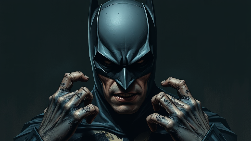Digital wallpaper portrait of Batman, Dark Knight, styled in comics, 8k resolution, rough and in the spirit of Marvel comics, emanating desperation against a dark background. Muted colors heighten the epic composition and dramatic, emotionally profound atmosphere, creating an intricate digital painting. Featuring text and elements of worst quality, with low resolution and jpeg artifacts. The artwork exhibits an intentionally ugly, duplicated appearance, with morbid, mutilated aspects. Characters have poorly drawn hands and faces with mutations that deformed and blurred features, suggesting dehydration, with bad anatomy and proportions. Expect extra limbs, cloned faces, disfigurement, and gross proportions. The portrayal includes malformed, missing, or extra arms and legs, alongside an unnaturally long neck. Details like camera angle, name, signature, watermark, logo, autograph, trademark are cut off or censored, contributing to the depiction of bad anatomy, body, face, and teeth with notable deformities.