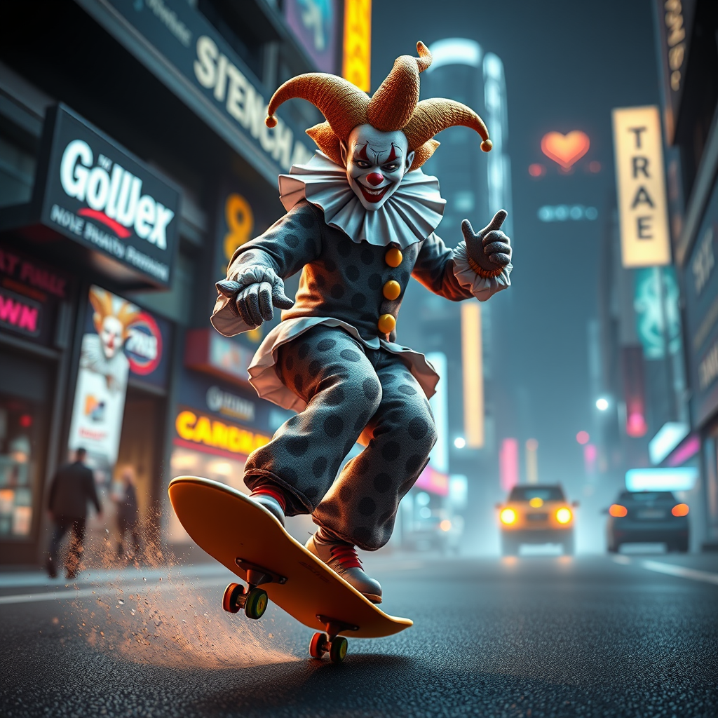 Digitally rendered futuristic clown skateboarding through a vibrant urban landscape, featuring intricate 3D modeling with a contemporary twist, highlighting a striking interplay of shadows and luminous golden accents against deep, dark backdrops.