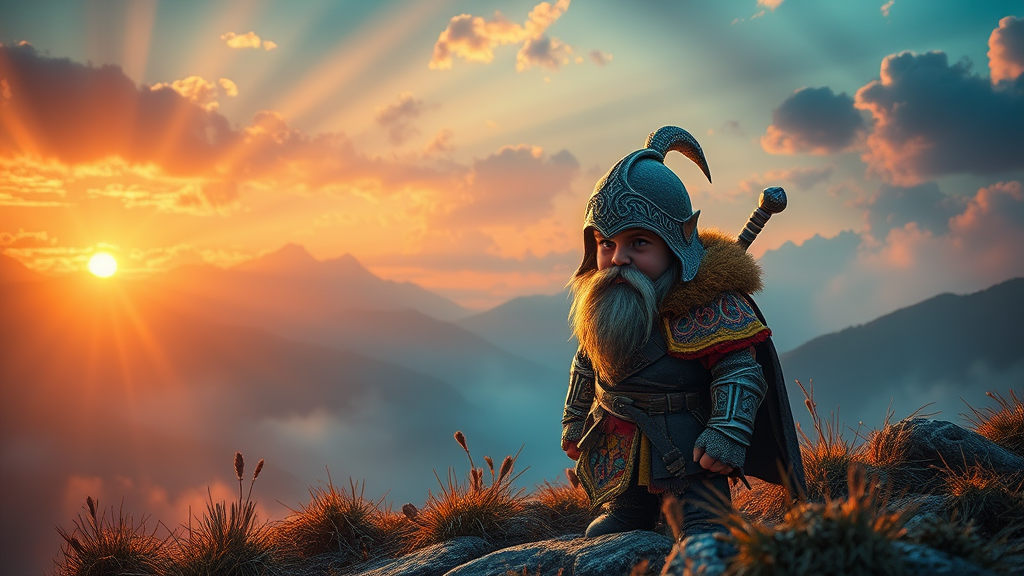 Diminutive warrior of the mystical highlands, with an unwavering focus, donning vibrant, intricately patterned armor. The scene bursts with a vivid palette under a dreamy luminescence, blending fantastic realism with cinematic grandeur. Enveloped in ethereal fairy light, dynamic motions create a symphony of color and shadow. Volumetric rays pierce through the mist, gracing the detailed landscape with an ethereal glow, captured in stunning HDR. The atmosphere conveys a mythical realm, where reality meets fantasy, embodied by the steadfast dwarf under the vast, magical skies.