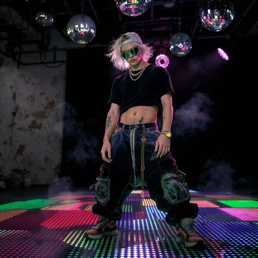 View this AI-generated image featuring disco inspired scene featuring a stunning young individual with a fit physique and short stylishly messy hair their ensemble includes intricately detailed baggy pants and a snug t shirt accessorized with goggles and a cap a glimpse of their midriff highlights a