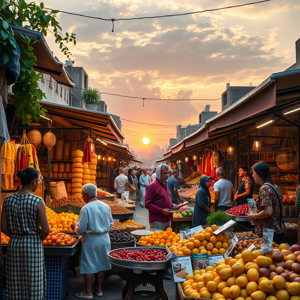 Discover the vibrant world of a bustling marketplace at dawn, where aromas of freshly baked bread and exotic spices mingle in the air, lively vendors enthusiastically barter with early-morning shoppers, and colorful displays of fruits and flowers create a sensory feast that ignites the spirit of adventure.